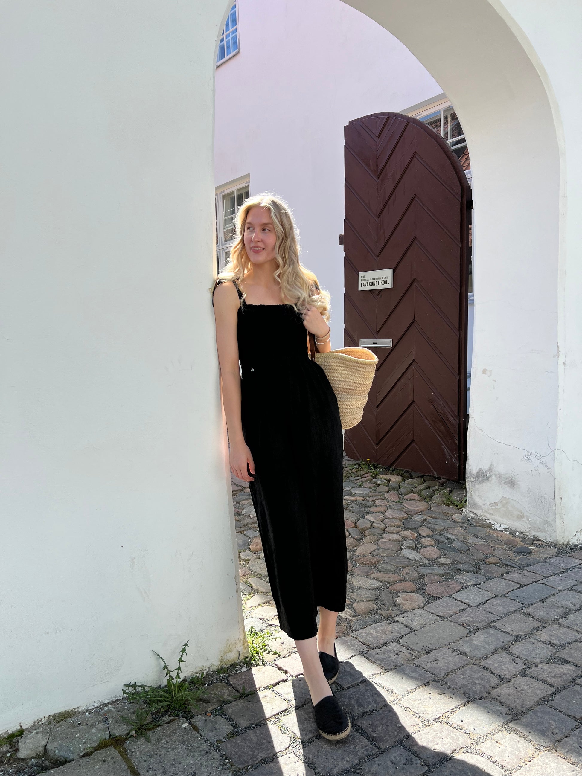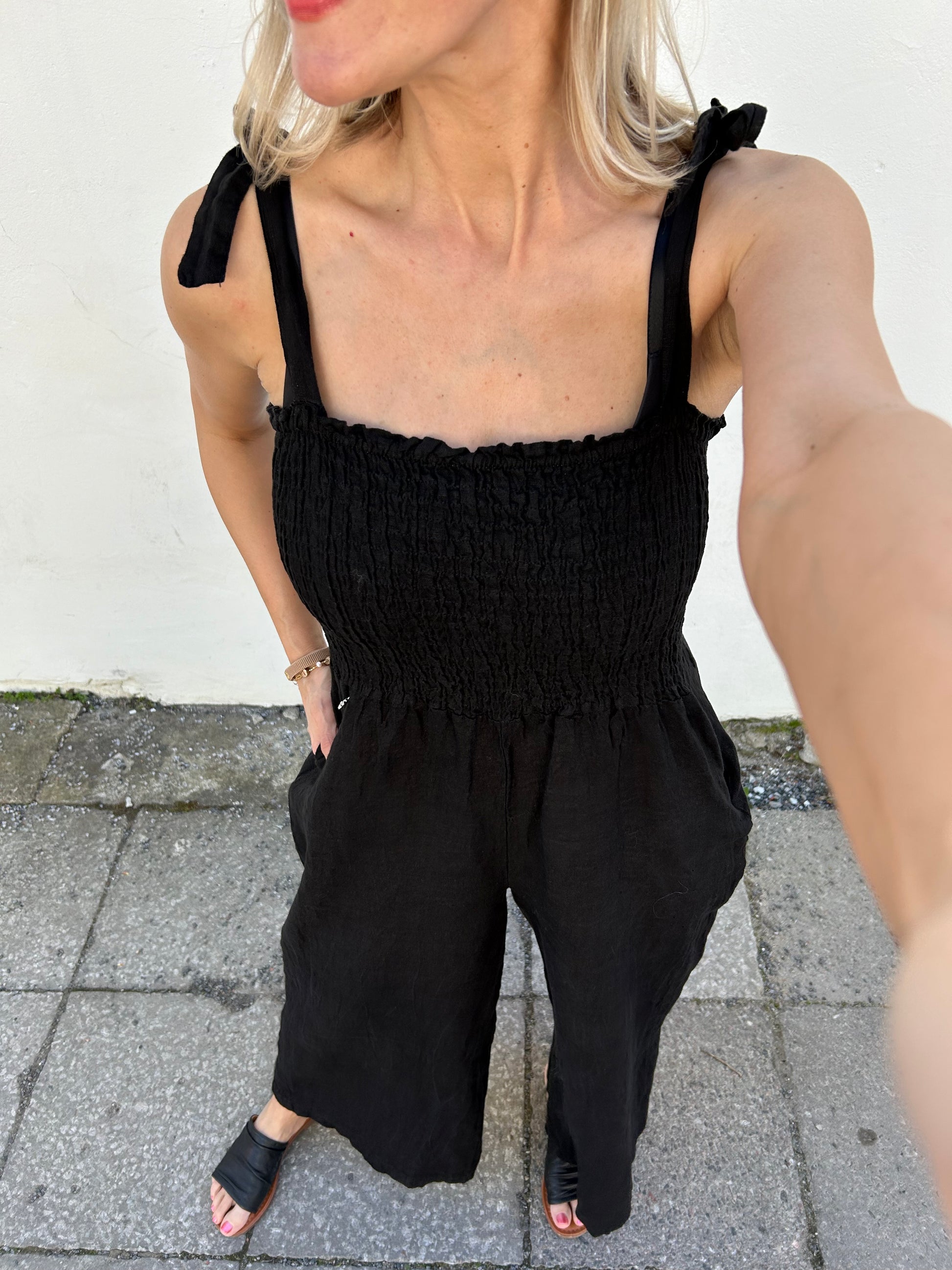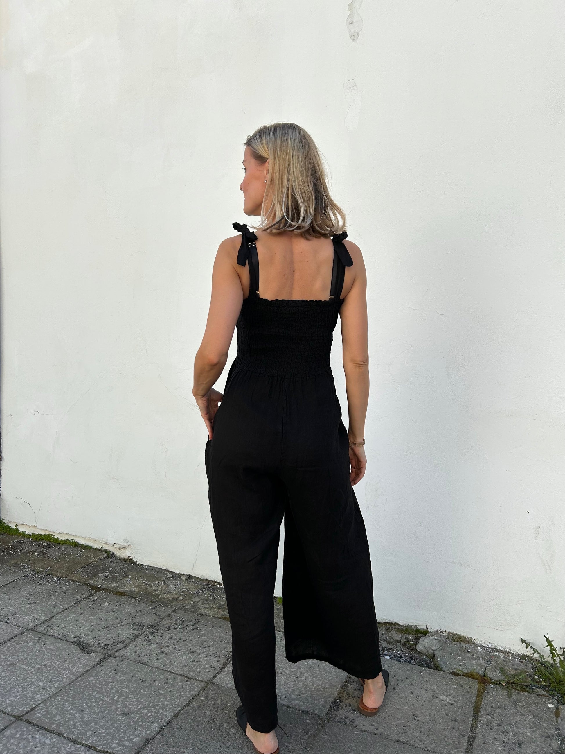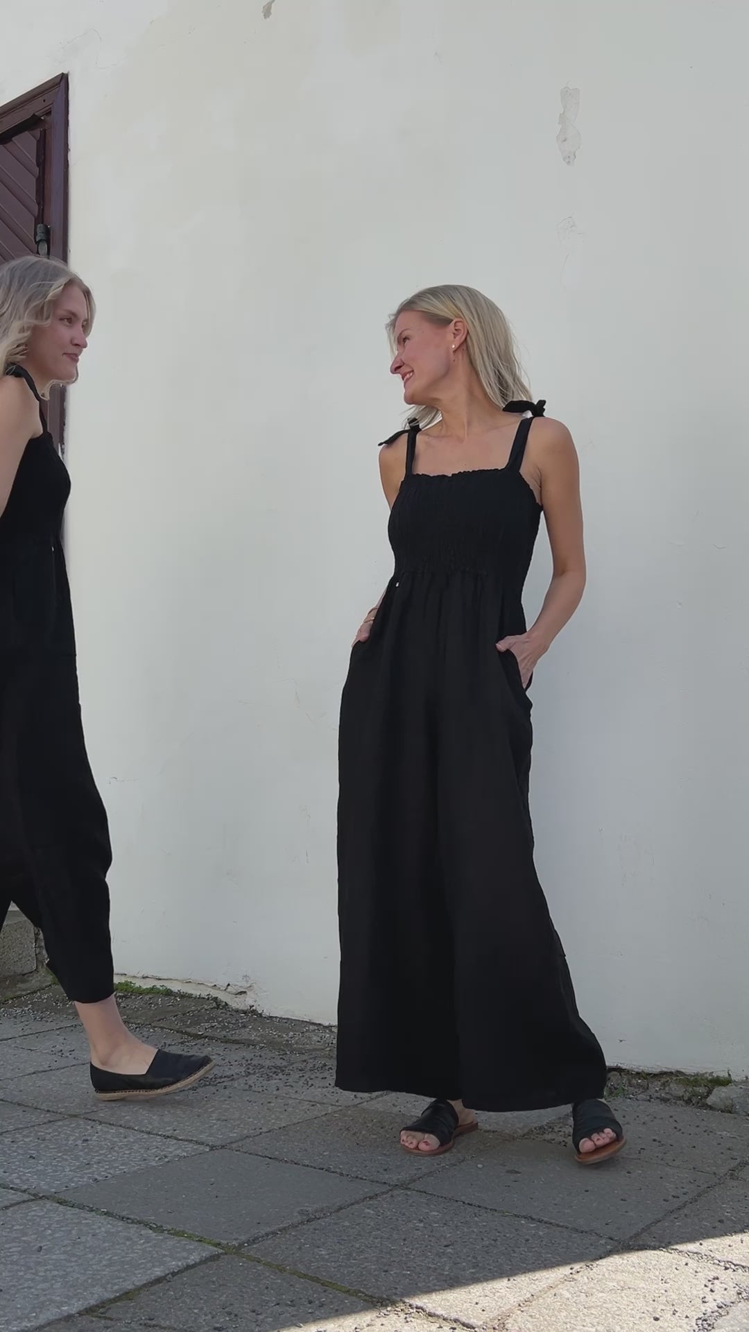 Stylish summer linen jumpsuit. Elastic tuxedo gathering at the top and straps at the shoulders will give you a great fit. You can also fasten the shoulder straps to make it suit you well. There are also pockets on the seams. And of course our signature Bloom Sis Bloom amulet on the right side of the waist.