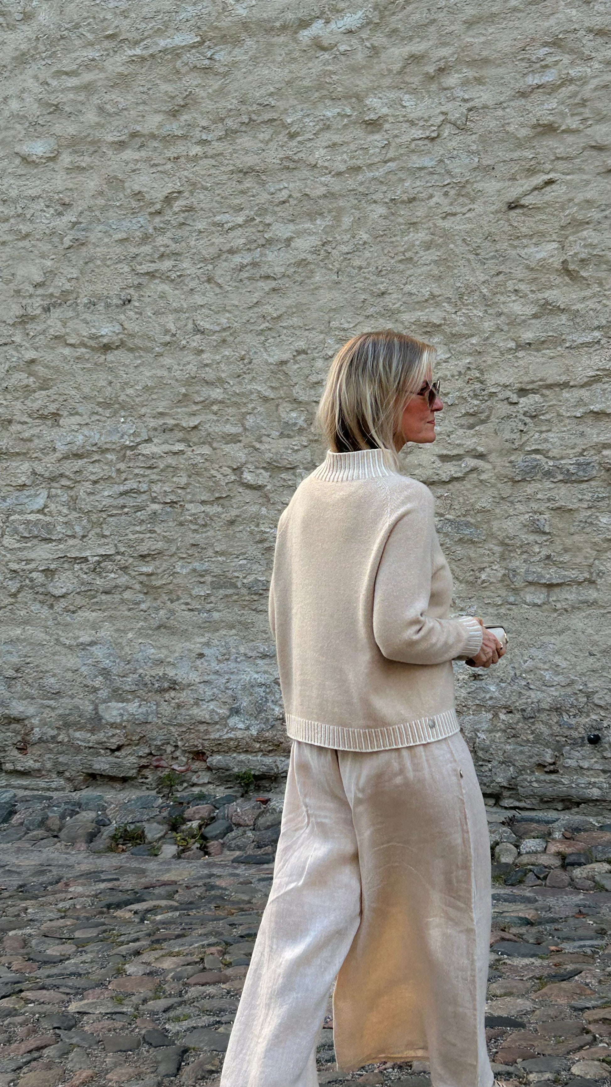 Autumn fresh morning breeze and cup of caffé latte are served in our Amalia turtle neck sweater in light beige. It´s delicate details on the sleaves and neck emphasize classic look. Carefully chosen, Amalia sweater features perfect medium fit and sophisticated wardrobe stable color. Perfect for summer evenings and early autumn days.