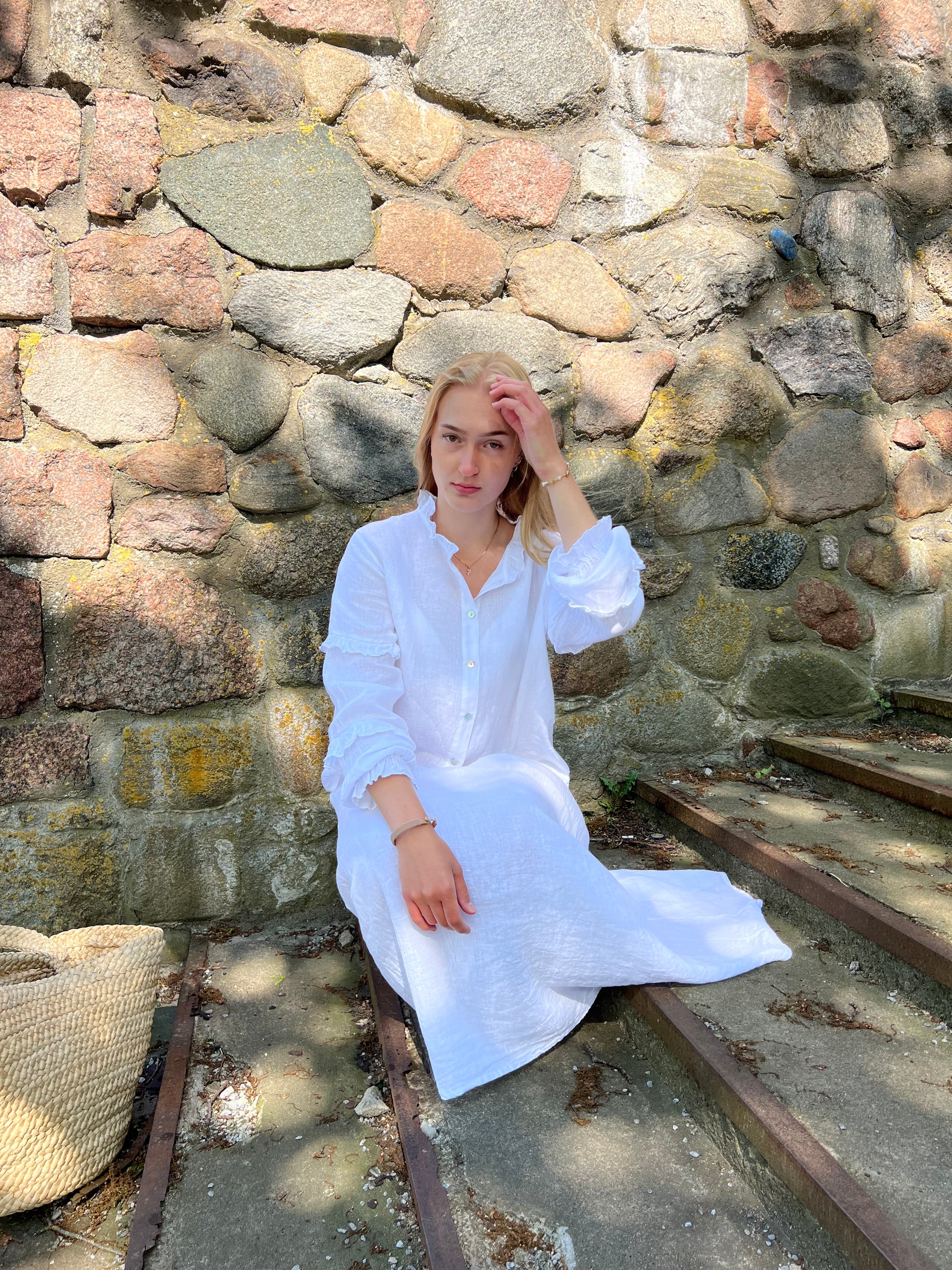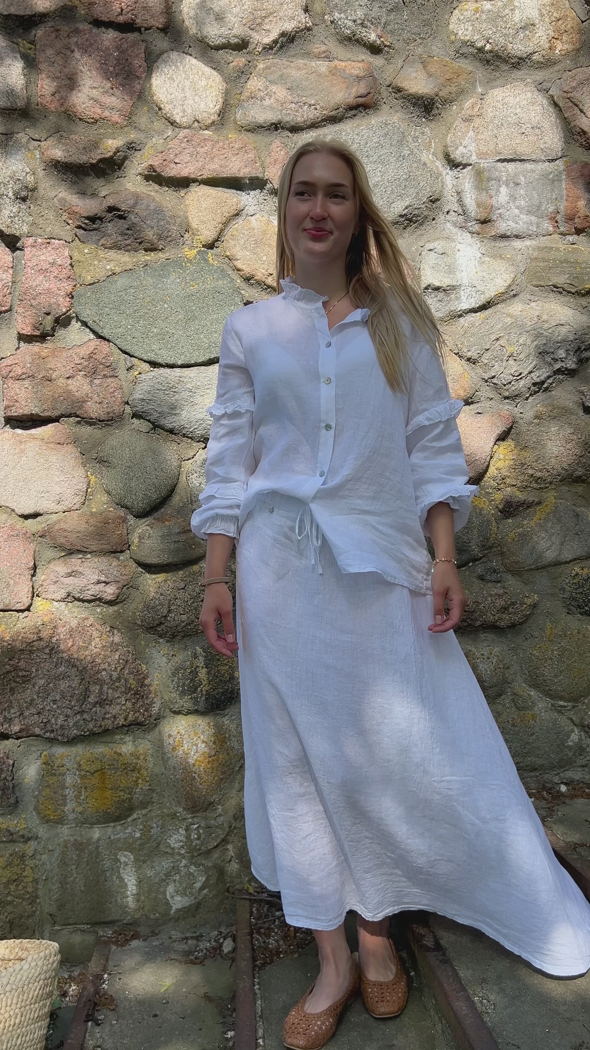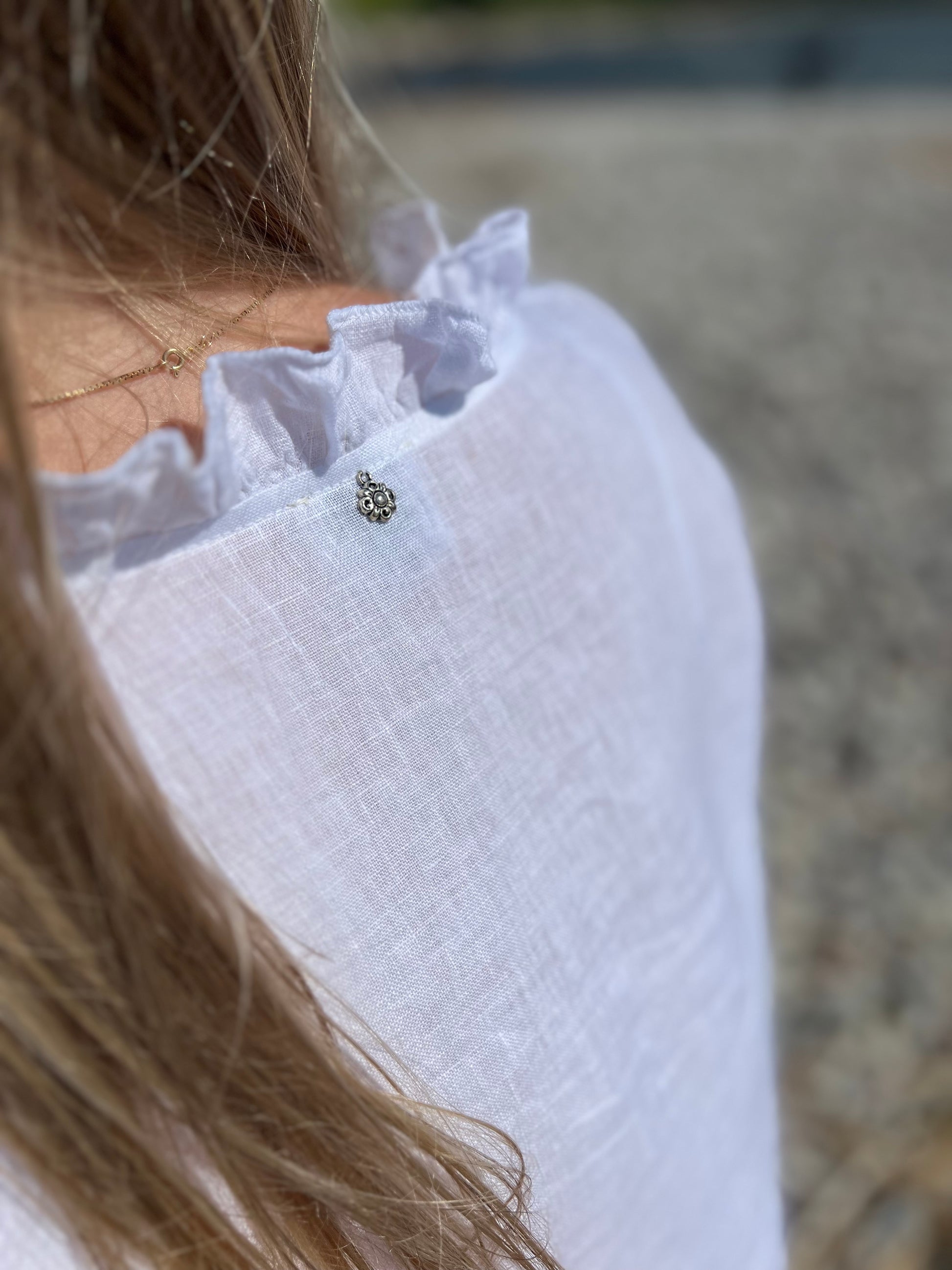 The Cassia blouse is a comfortable blouse with frills. Thanks to the buttoned shirt it can be styled and worn in different ways. We love to pair this blouse with our Thea skirt. And of course, it has our signature amulet detail.