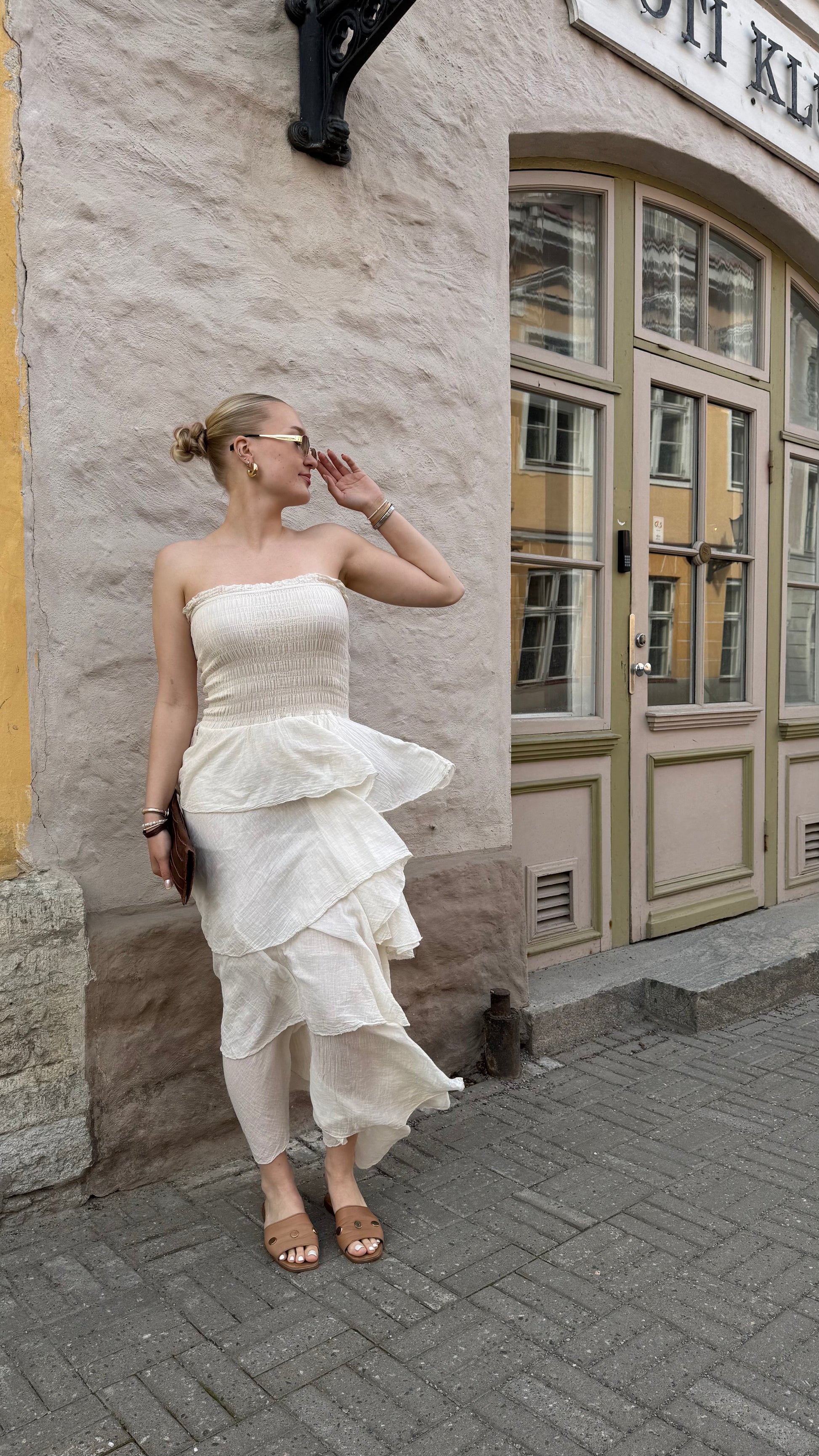 With its strapless cut and maxi length, Dawn strikes the perfect balance between romantic and effortless. Lightweight and airy, it moves beautifully with every step — heading to a sun-drenched dinner.