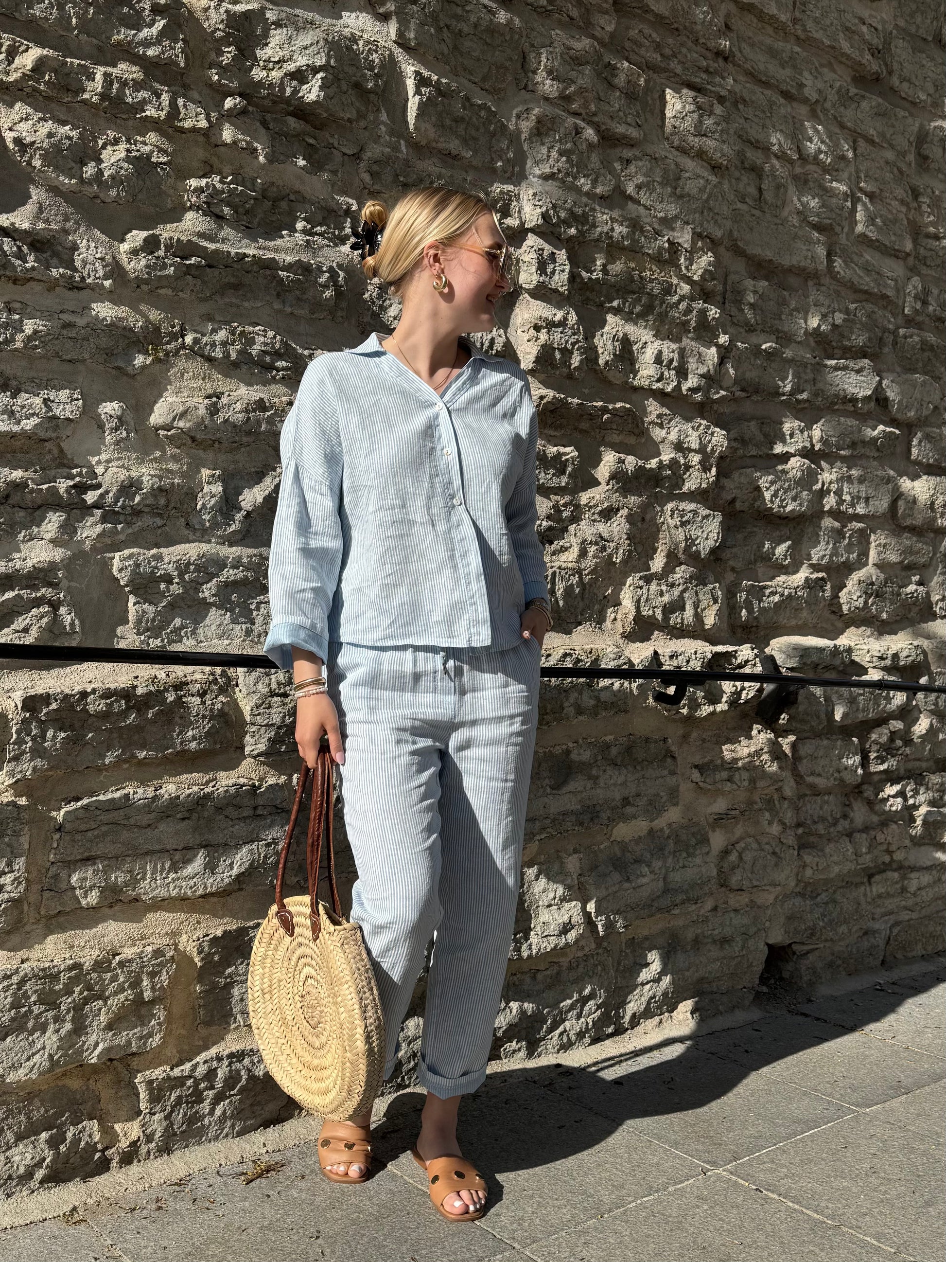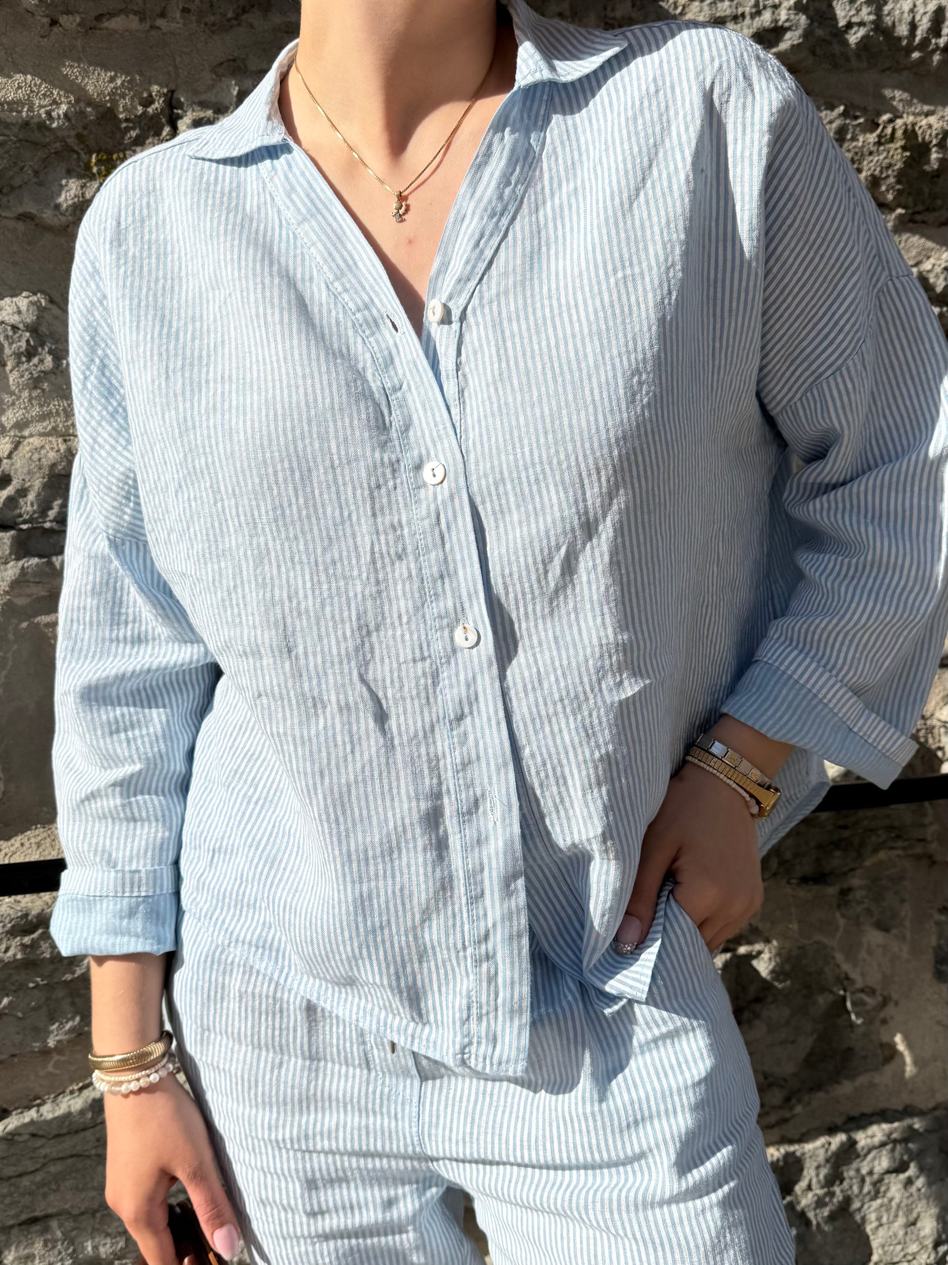 Light, effortless, and made to move with the breeze — the Elaine blouse brings quiet elegance to everyday dressing. Crafted from soft, breathable linen in a baby blue hue, it features a relaxed silhouette with 3/4 sleeves and a subtle collar for a clean, coastal look.
