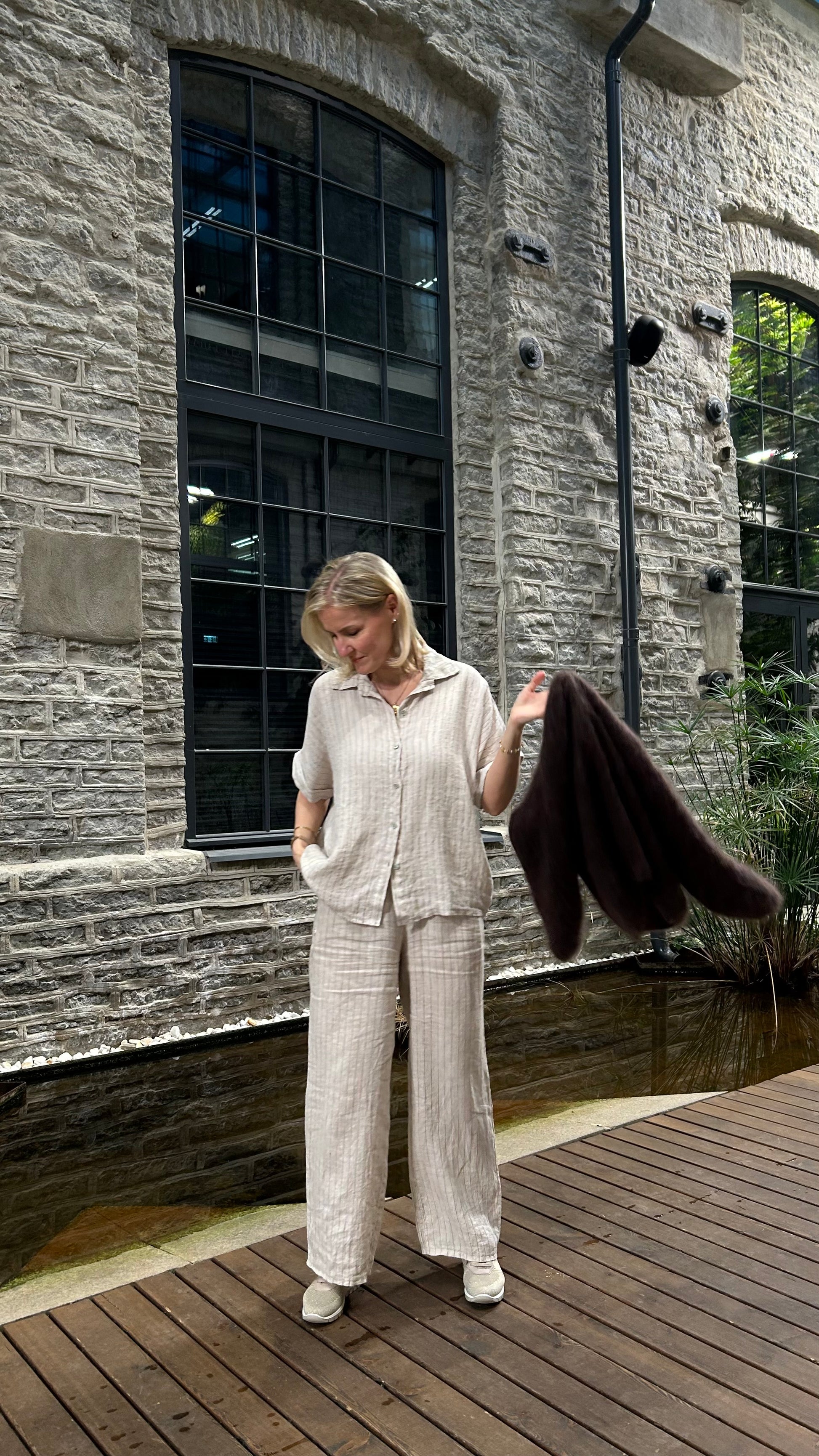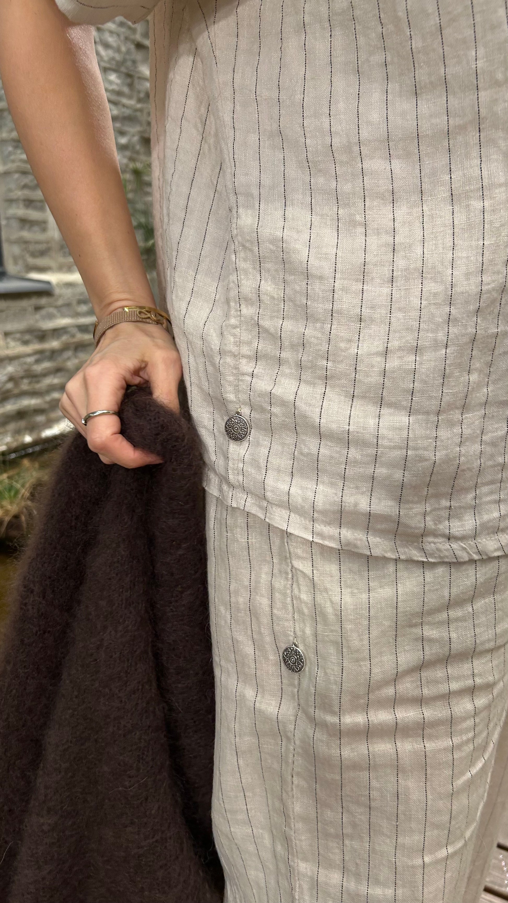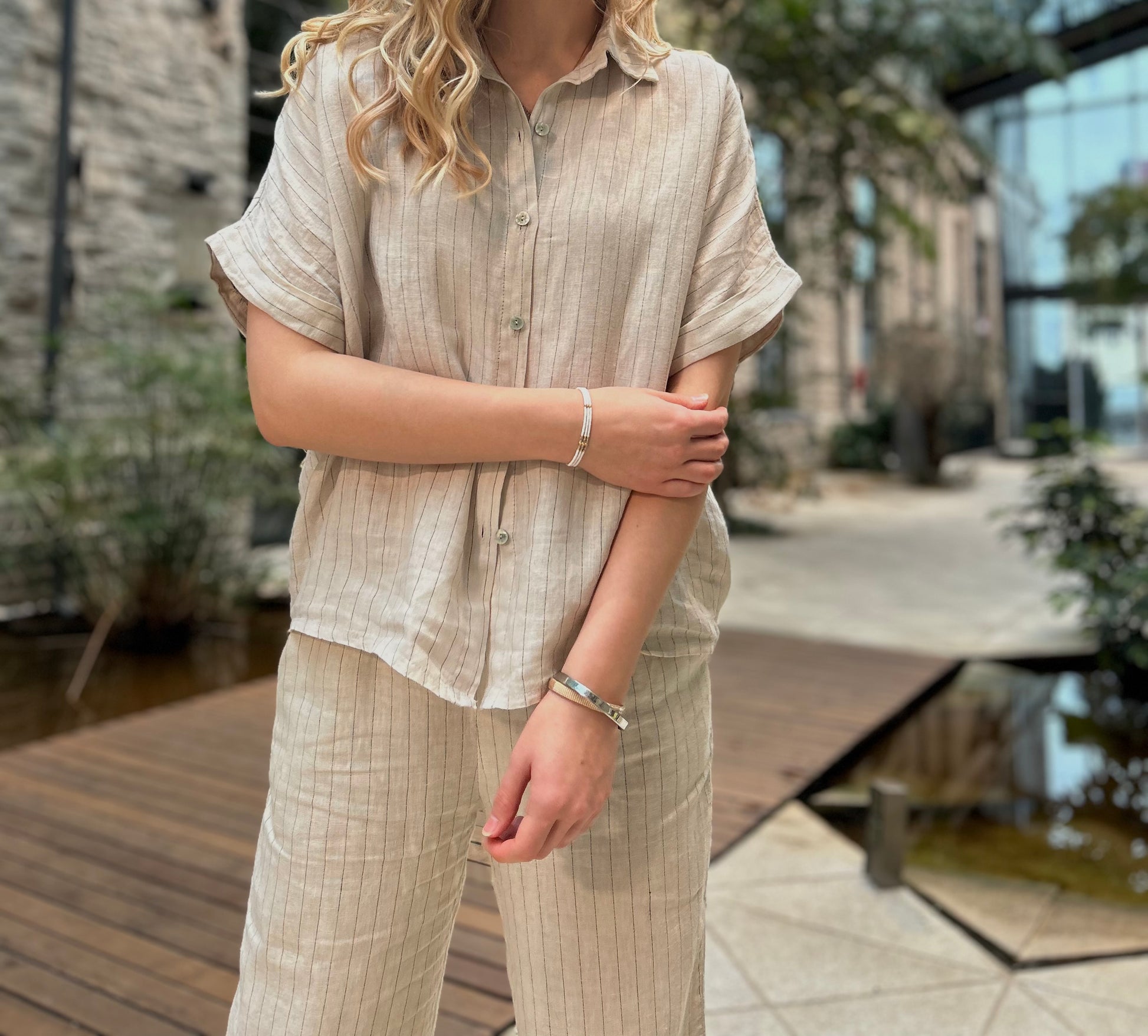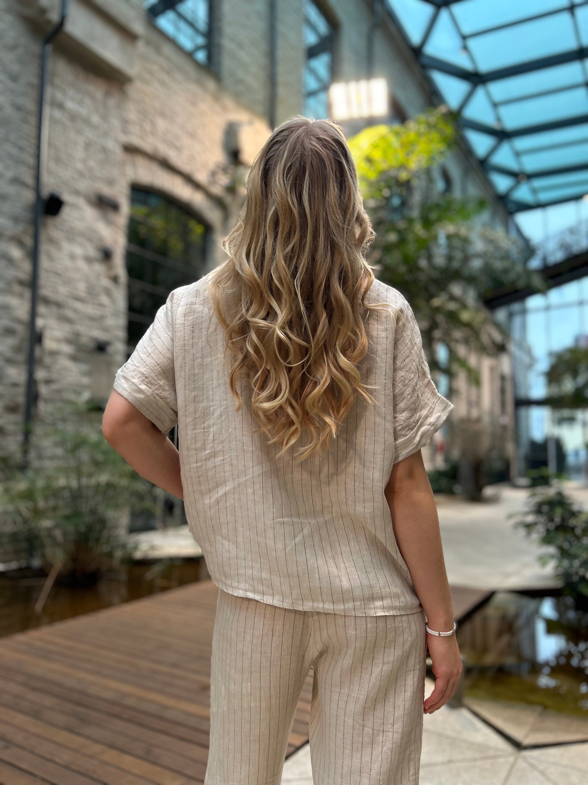 You certainly can put faith on this blouse. Designed for a relaxed fit, it drapes beautifully, offering both comfort and timeless style. Perfect for capturing Mediterranean vibes in laid-back look. Embrace effortless look with light sand hue with delicate grey stripes. Wearable as set with Faith -pants.