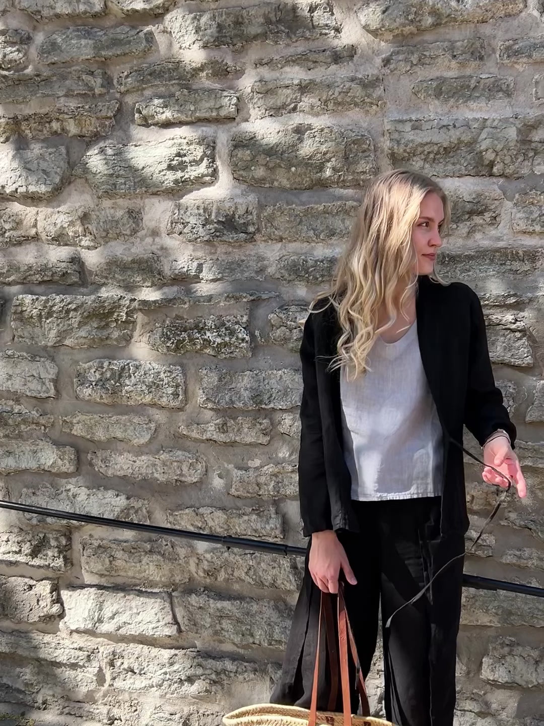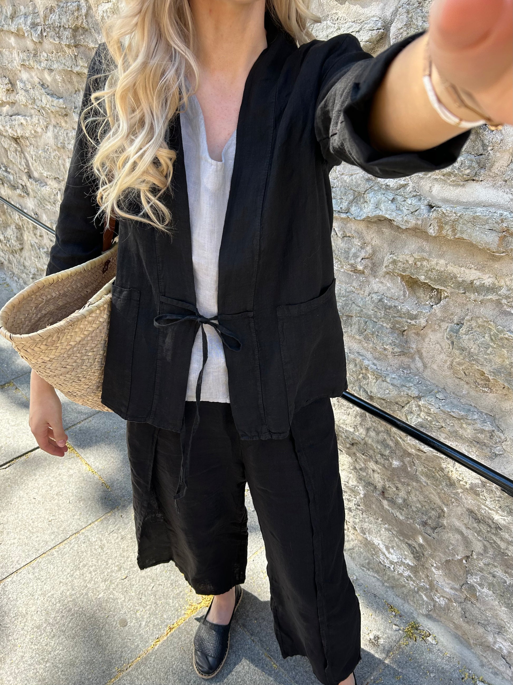 Stylish blazer with front pockets and laces. Relaxed oversize model and wonderfully soft on top. Bloom Sis Bloom amulet on the neck.