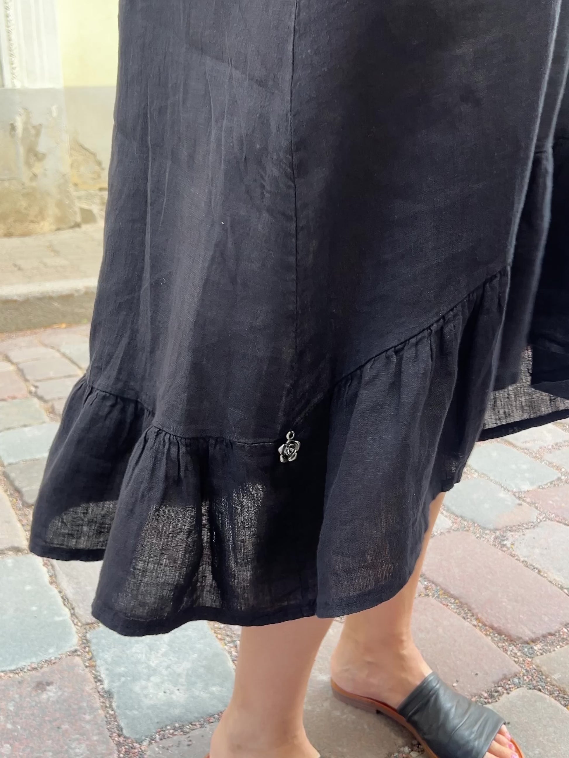 A wonderful linen dress with a beautiful frill on the hem. The neckline is stretchy, so you can also wear it as off-shoulder. Pockets in the side seams. The hem is longer at the back. Bloom Sis Bloom amulet on the hem.