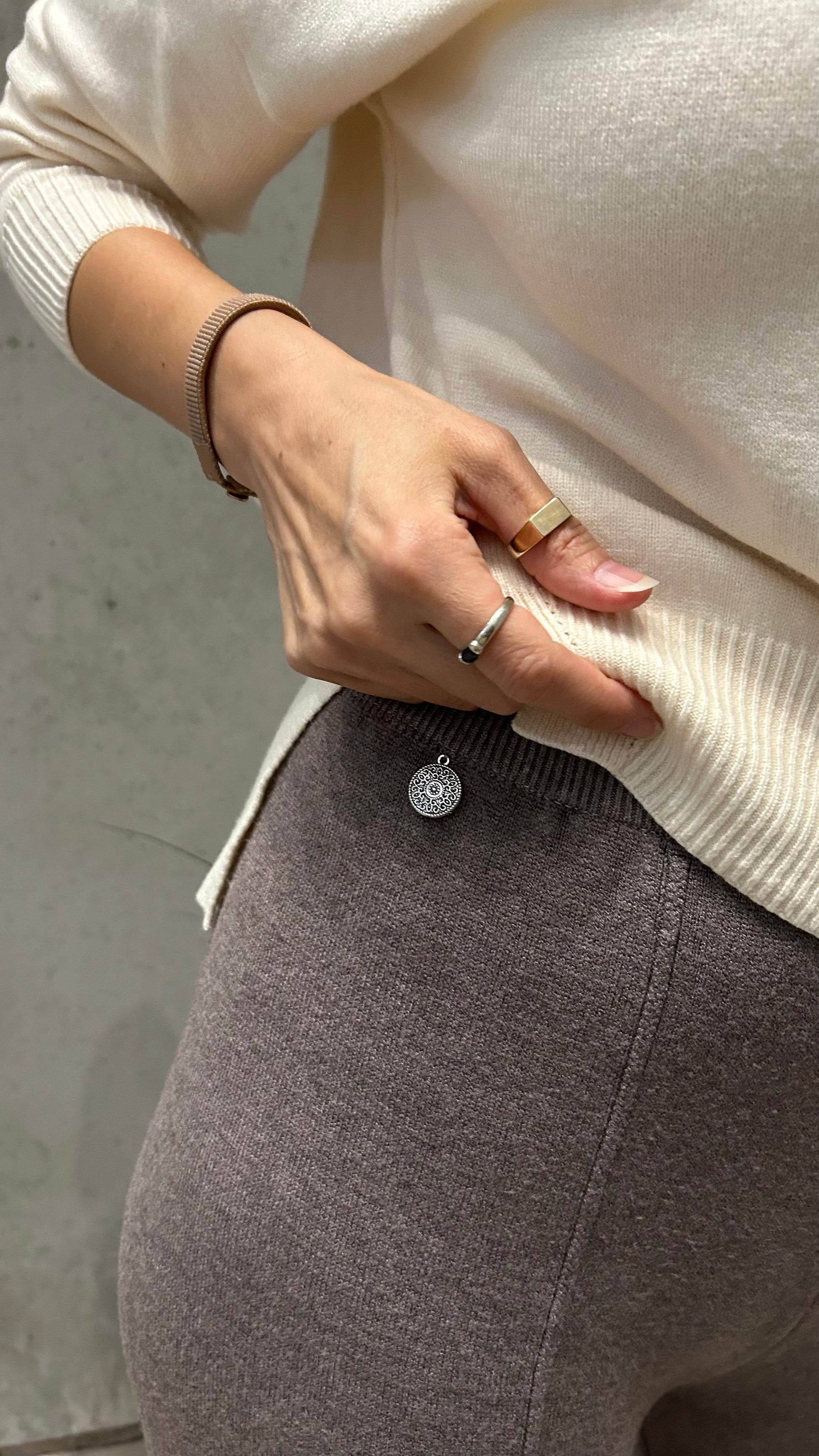 Take a step into the world of softness with our Selene knit trousers in chai. Designed for perfect fit and comfort, these knit trousers feature softness, fake seam at the front and slits at the ankles for that perfect airport look. With an elasticized waistband, it's effortlessly chic and a little finishing touch: our signature amulet is the cherry on top.