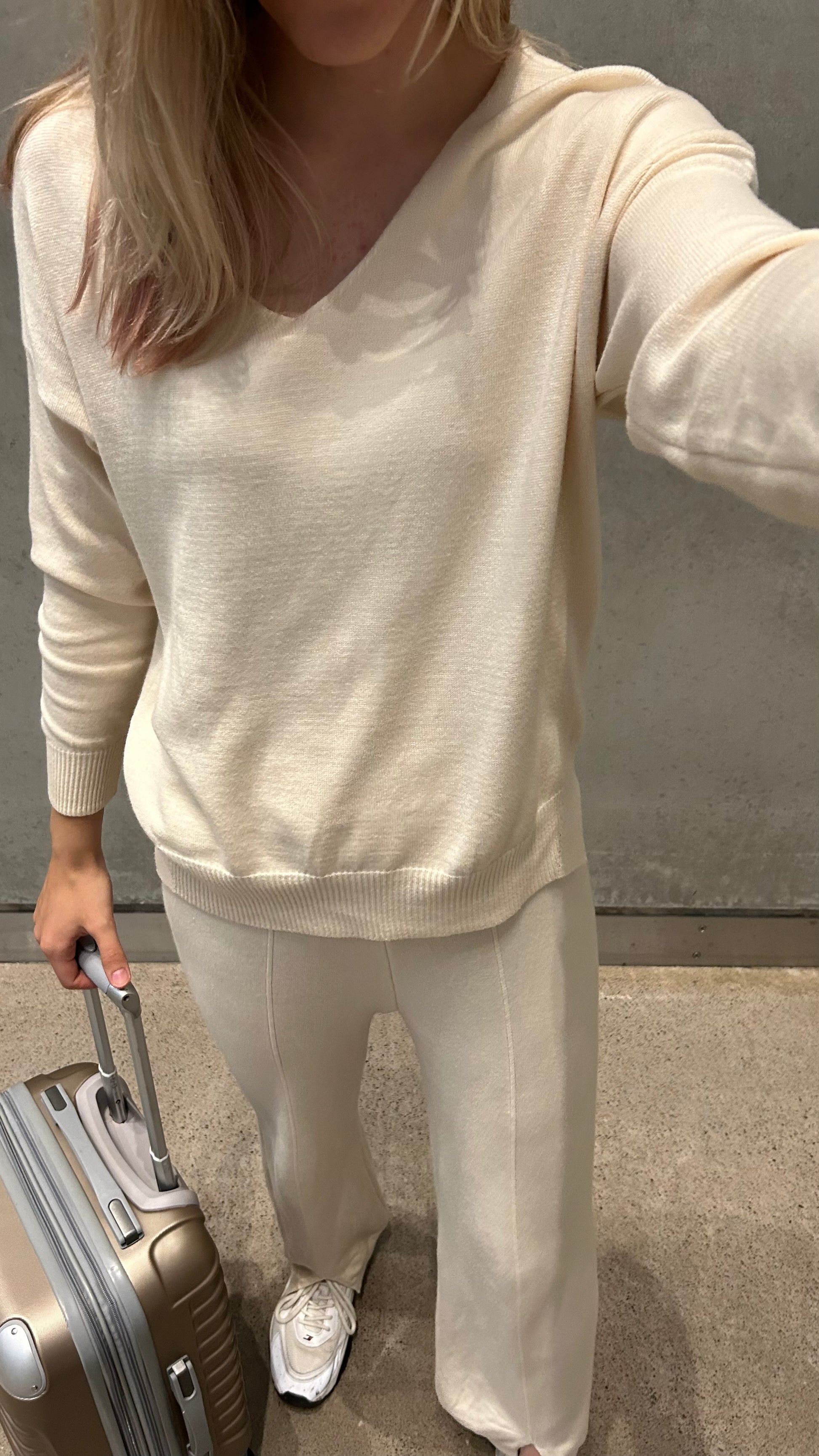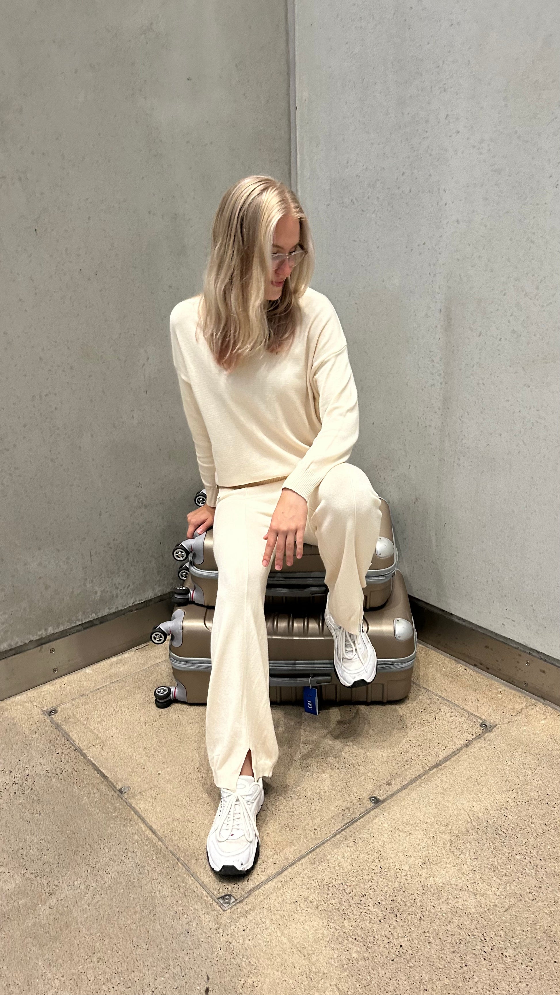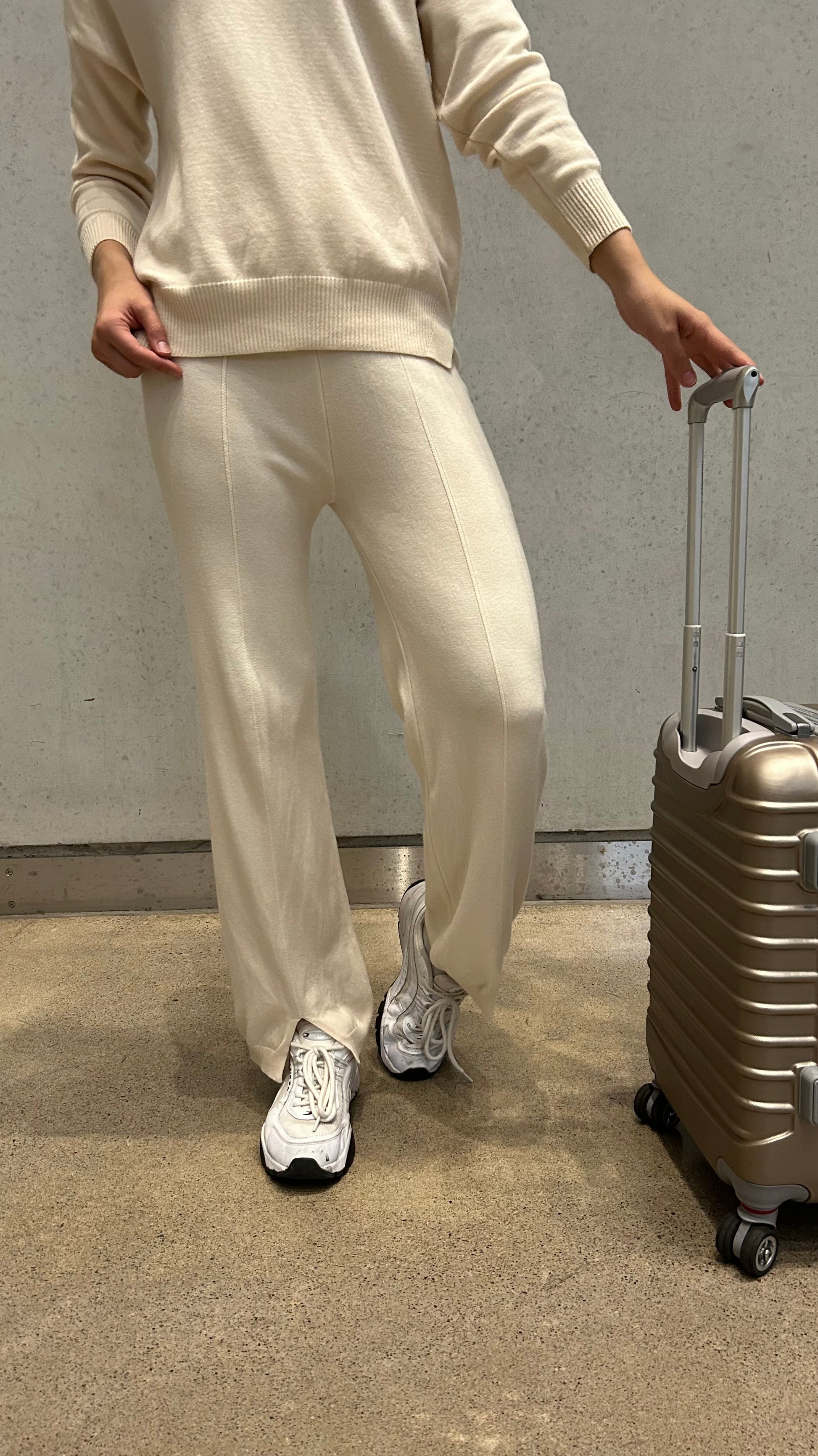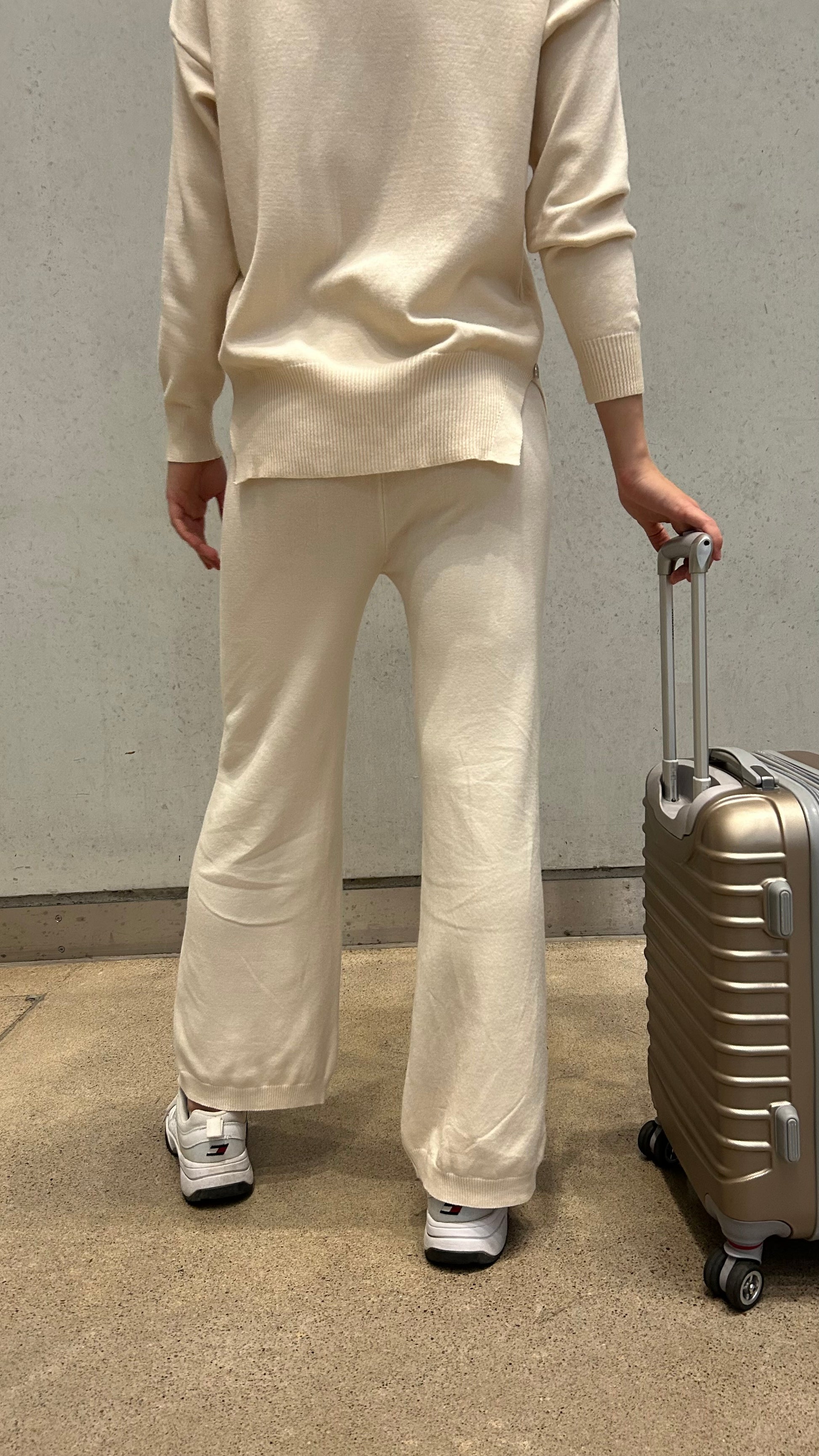 Take a step into the world of softness with our Selene knit trousers in vanilla. Designed for perfect fit and comfort, these knit trousers feature softness, fake seam at the front and slits at the ankles for that perfect airport look. With an elasticized waistband, it's effortlessly chic and a little finishing touch: our signature amulet is the cherry on top.