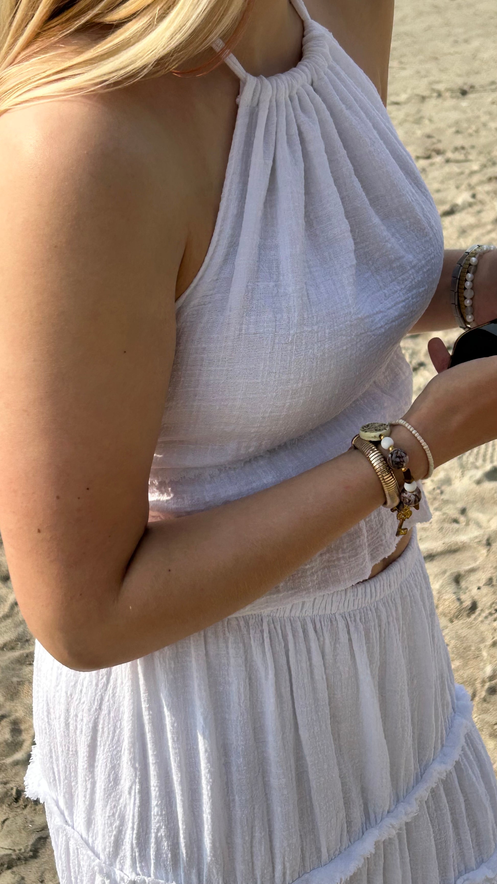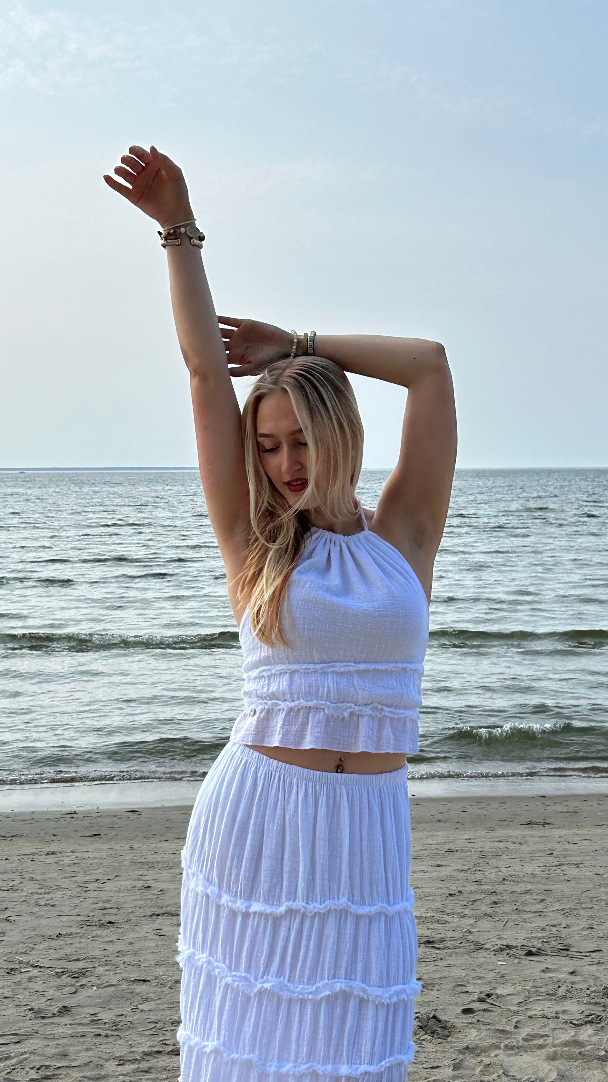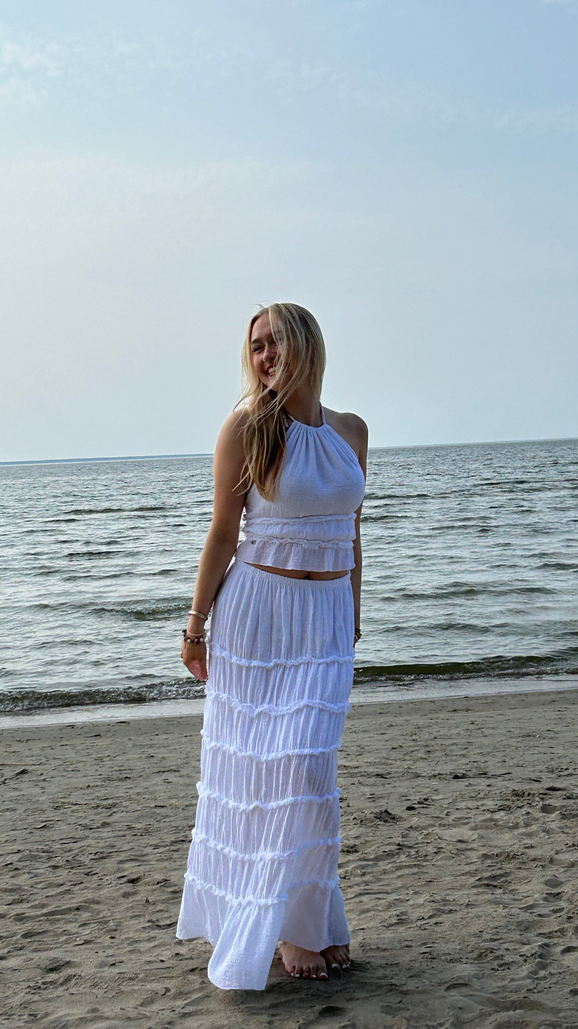 Light as the ocean air and effortlessly elegant, the Thalia is your go-to for sun-kissed days and balmy beach walks. Made from airy cotton gauze in timeless white, this two-piece ensemble features a halter-style crop top and a flowy high-waisted maxi skirt with soft, gathered texture that sways with every step.
