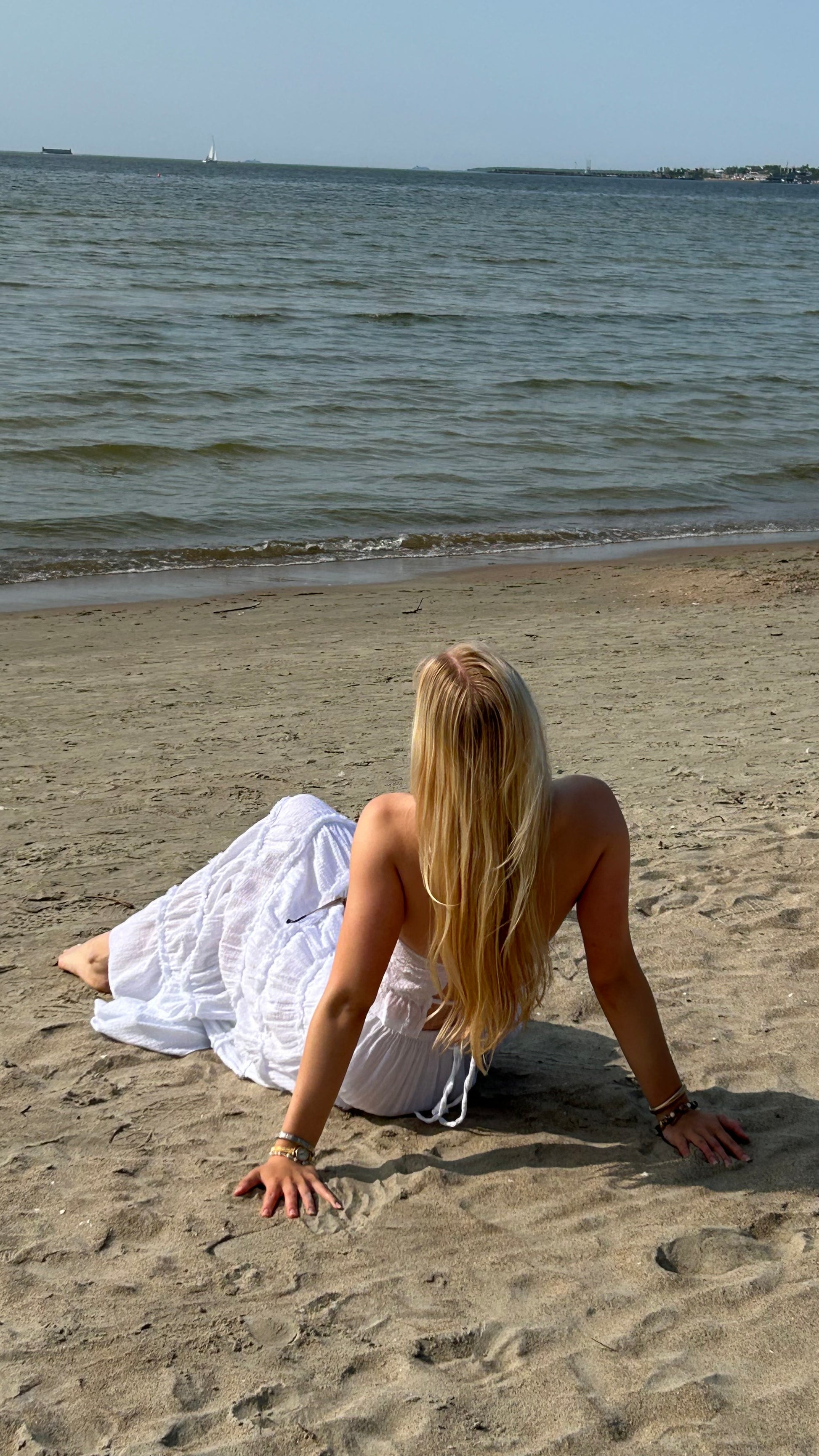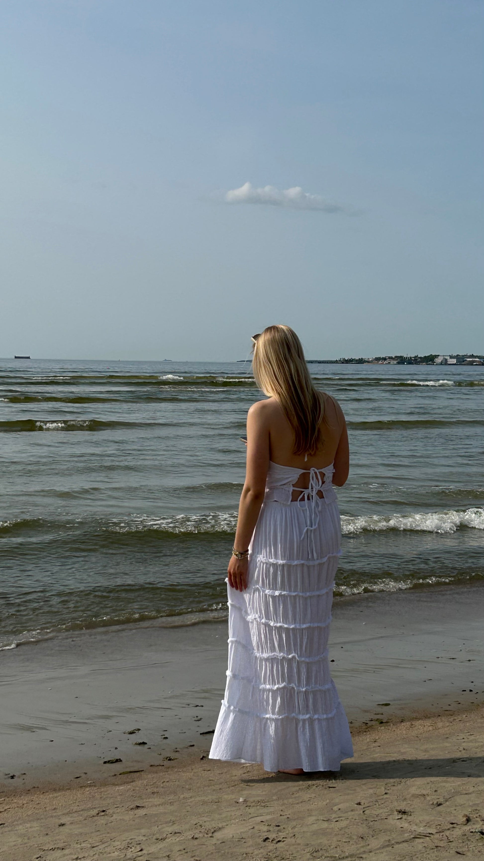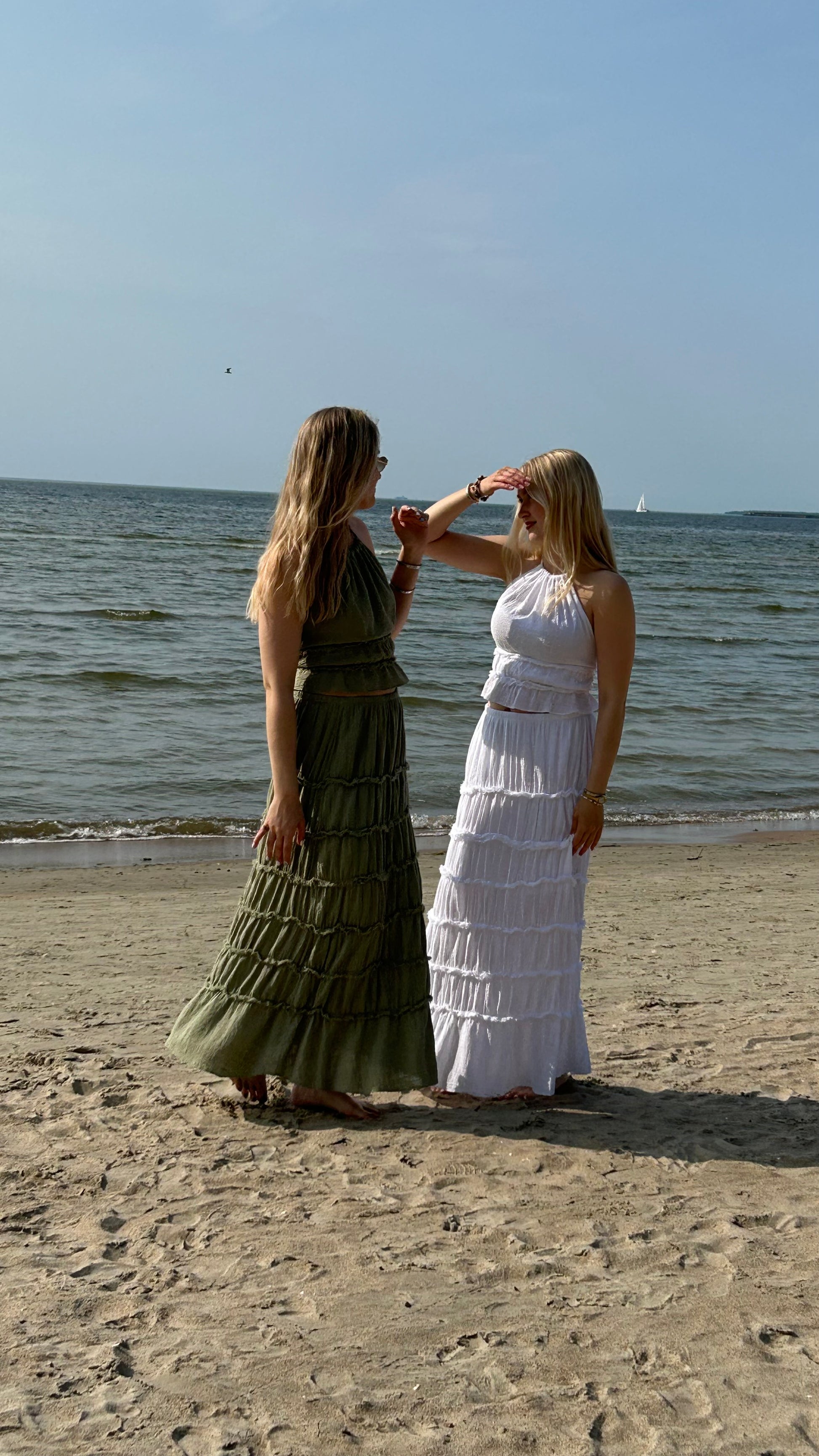 Light as the ocean air and effortlessly elegant, the Thalia is your go-to for sun-kissed days and balmy beach walks. Made from airy cotton gauze in timeless white, this two-piece ensemble features a halter-style crop top and a flowy high-waisted maxi skirt with soft, gathered texture that sways with every step.