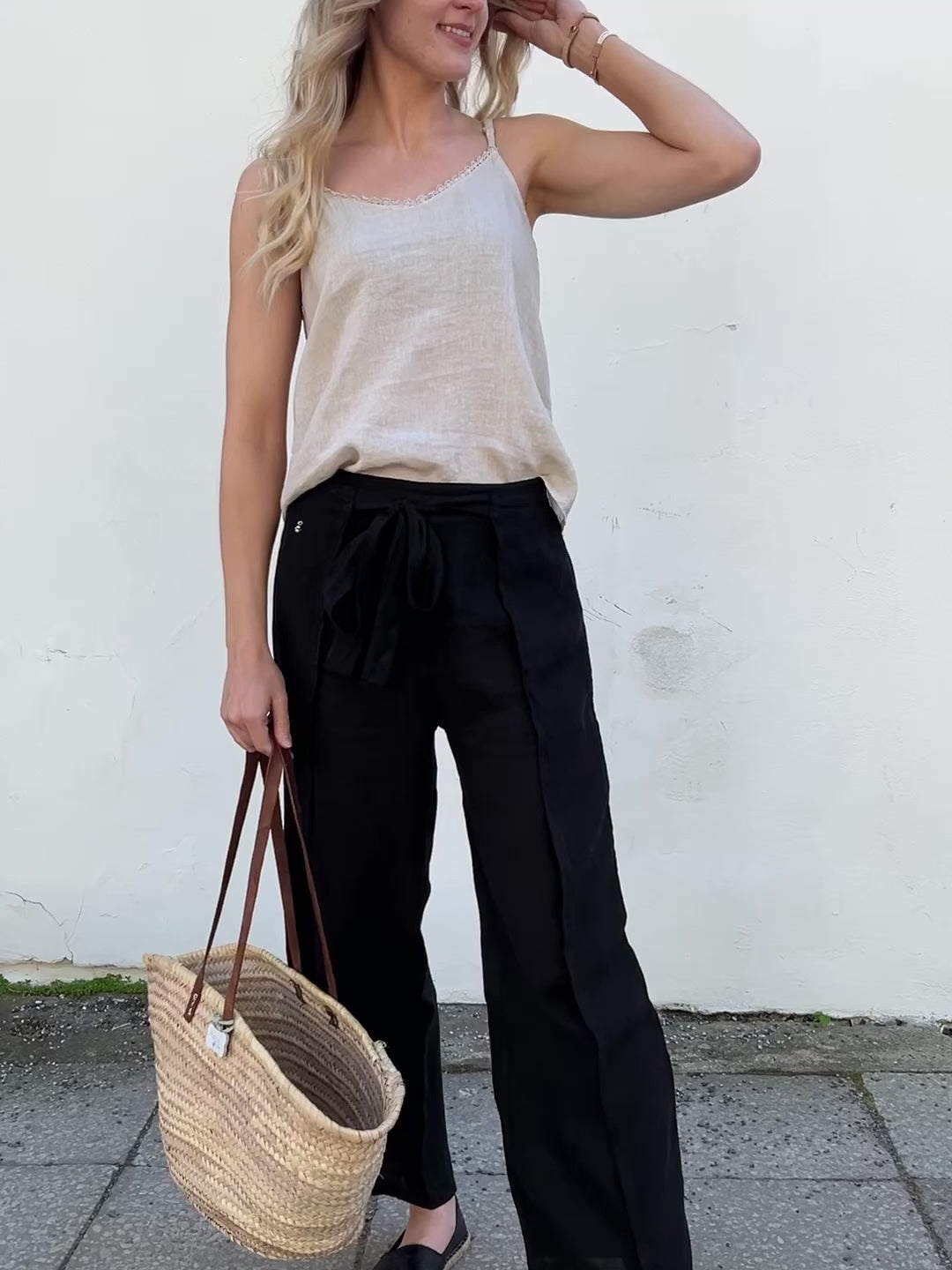 Lovely linen pants. At the waist, there is an elastic elastic band at the back and linen bands at the front, from which the extra fabric piece falls beautifully along the leg. On the right side, the beautiful Bloom Sis Bloom amulet.